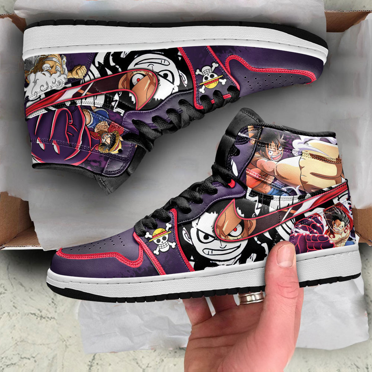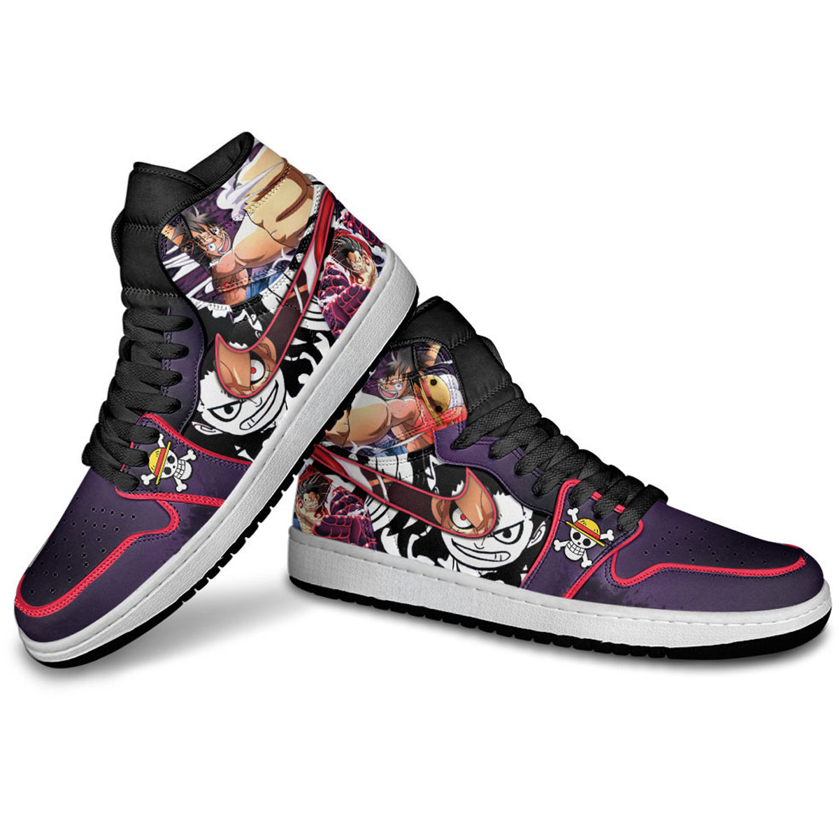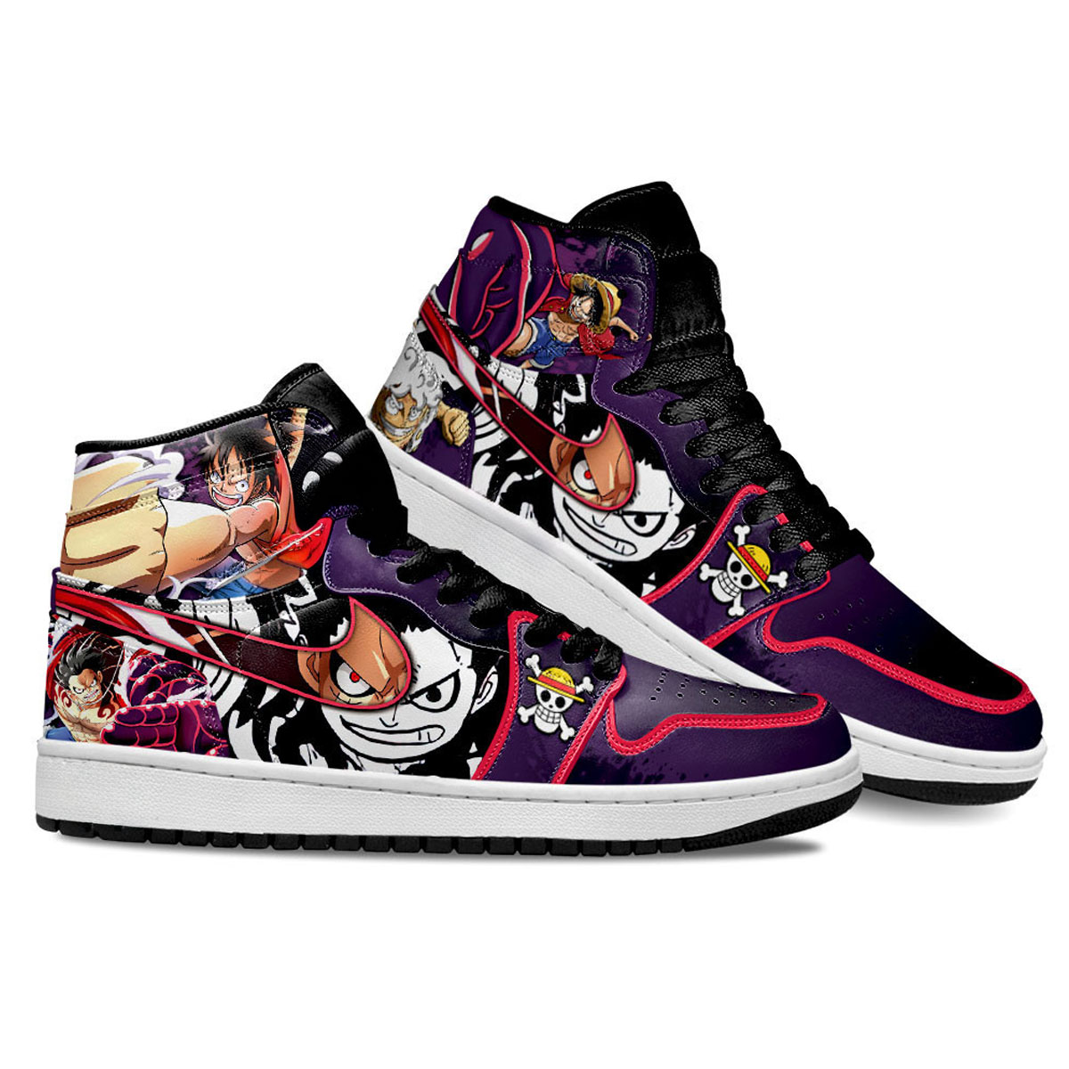 A powerful design inspired by Luffy’s Haki moments, blending intense expressions with dark, high-contrast panels. The mix of purple tones and striking artwork gives this pair a strong, battle-ready presence—crafted by One Piece Verse.