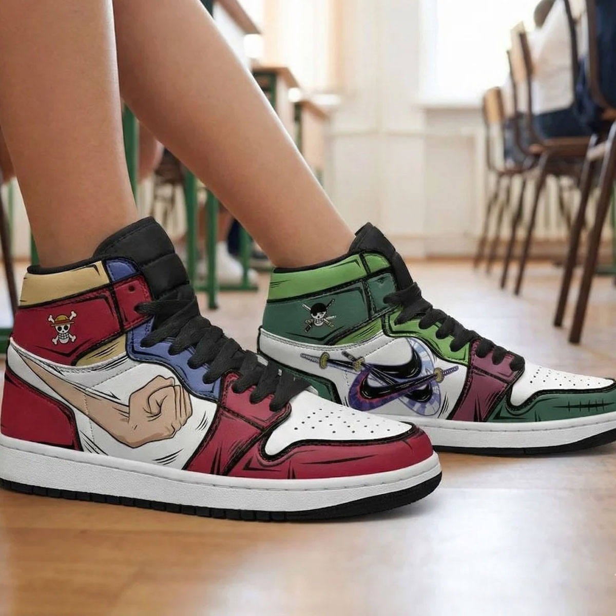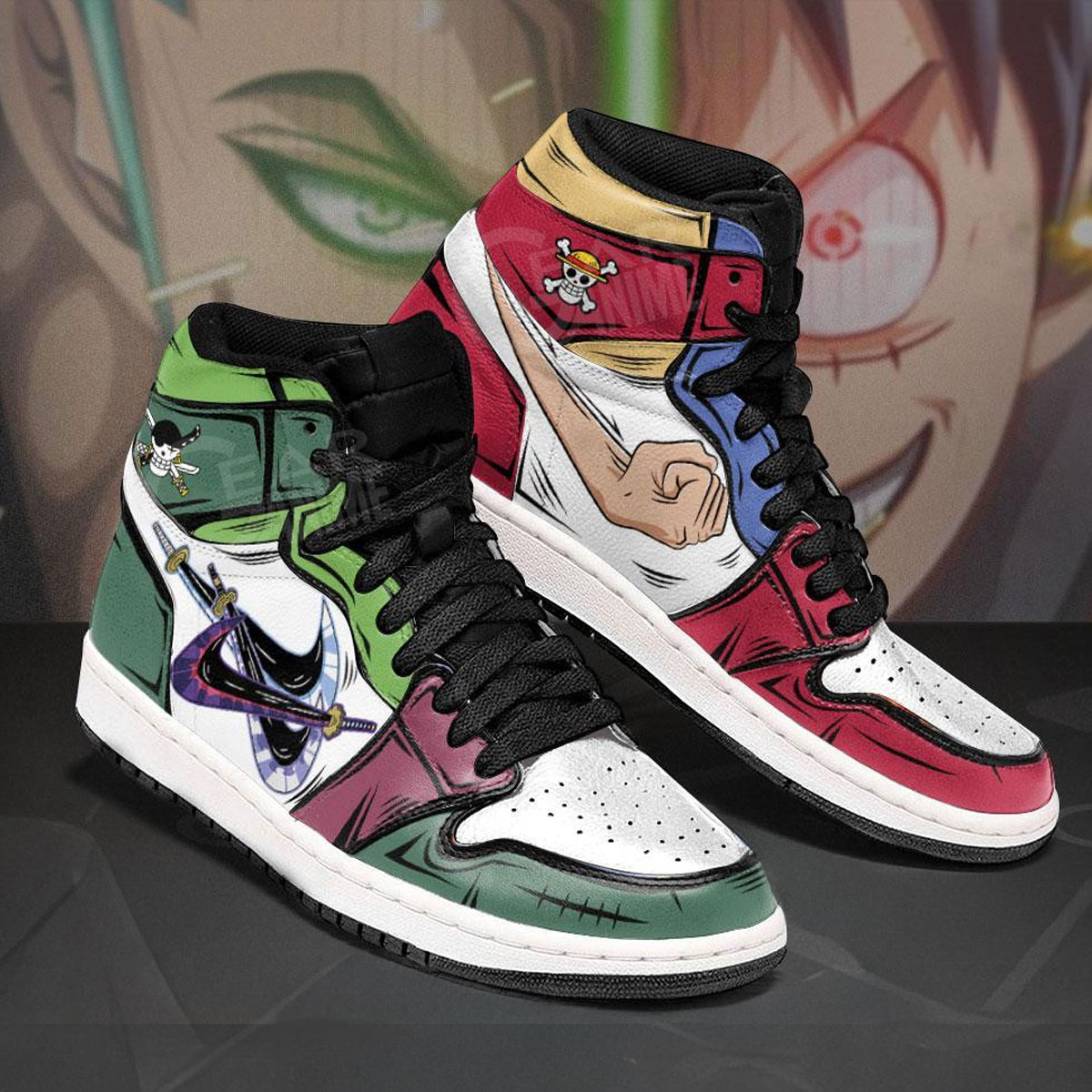 Perfect for One Piece fans who want both Luffy’s freedom and Zoro’s edge in one standout pair. Great for daily wear, anime events, or as a unique gift.