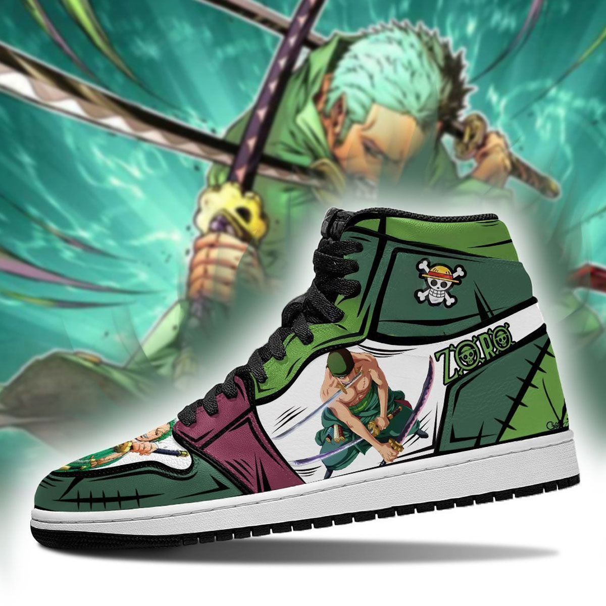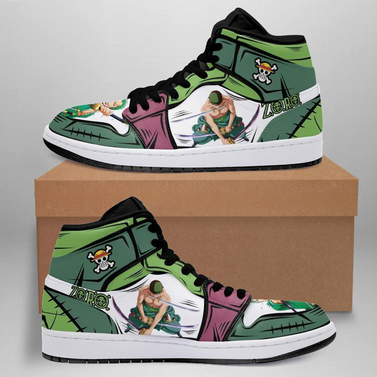 Channel the spirit of the strongest swordsman with this Zoro-inspired design. Featuring dynamic poses and signature green tones, this pair captures the intensity and precision of Zoro’s fighting style—brought to life by One Piece Verse.