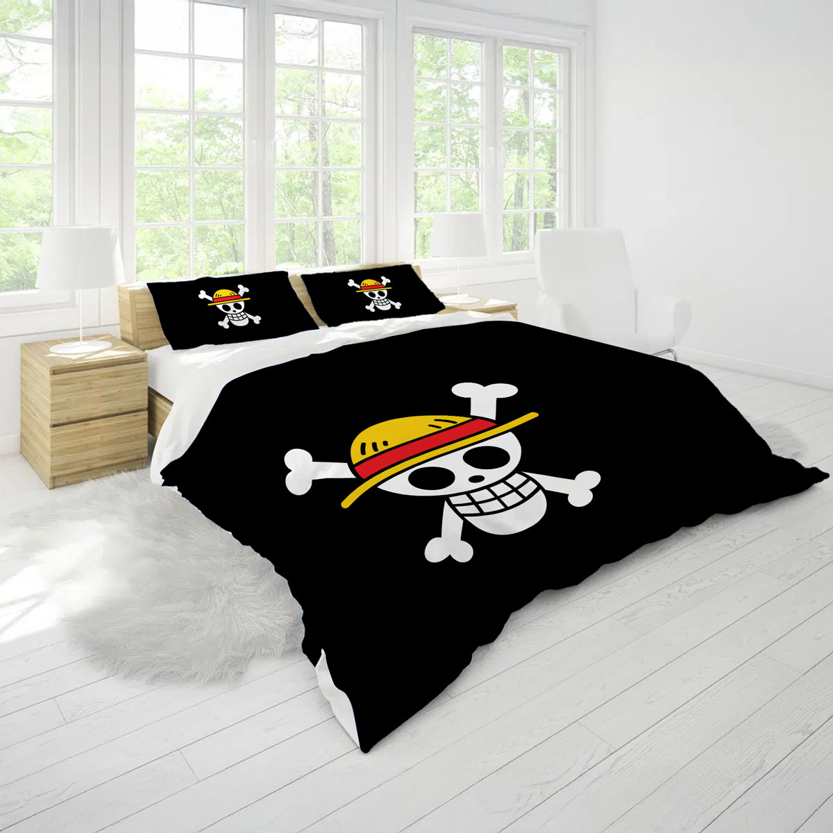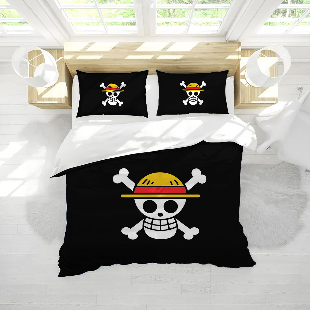 One Piece Straw Hat Jolly Roger Black Bedding Set