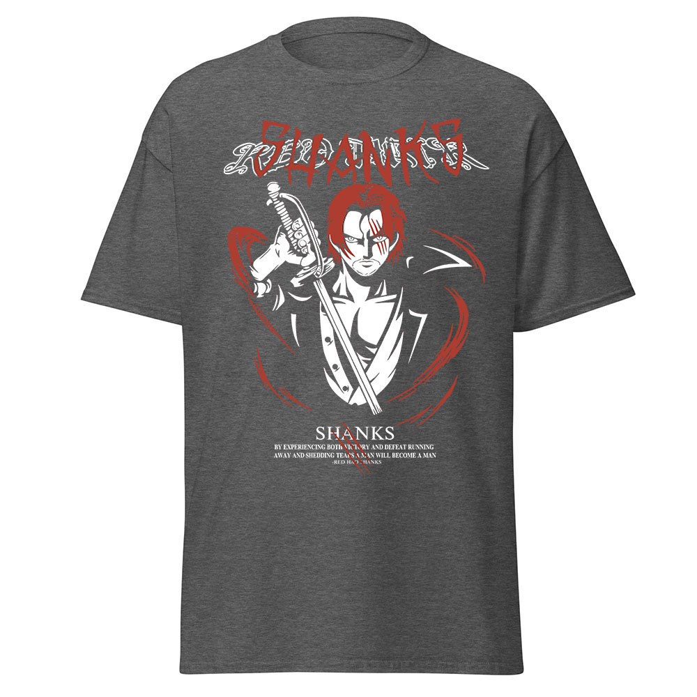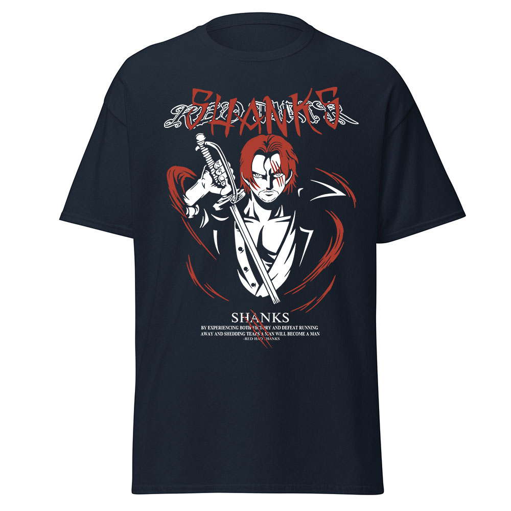 The Red-Haired Shanks Sword Aura One Piece T Shirt captures Shanks in his most iconic form—calm, fearless, and lethal. With his sword drawn and red energy swirling around him, this design reflects the authority of a Yonko who rules through presence alone.